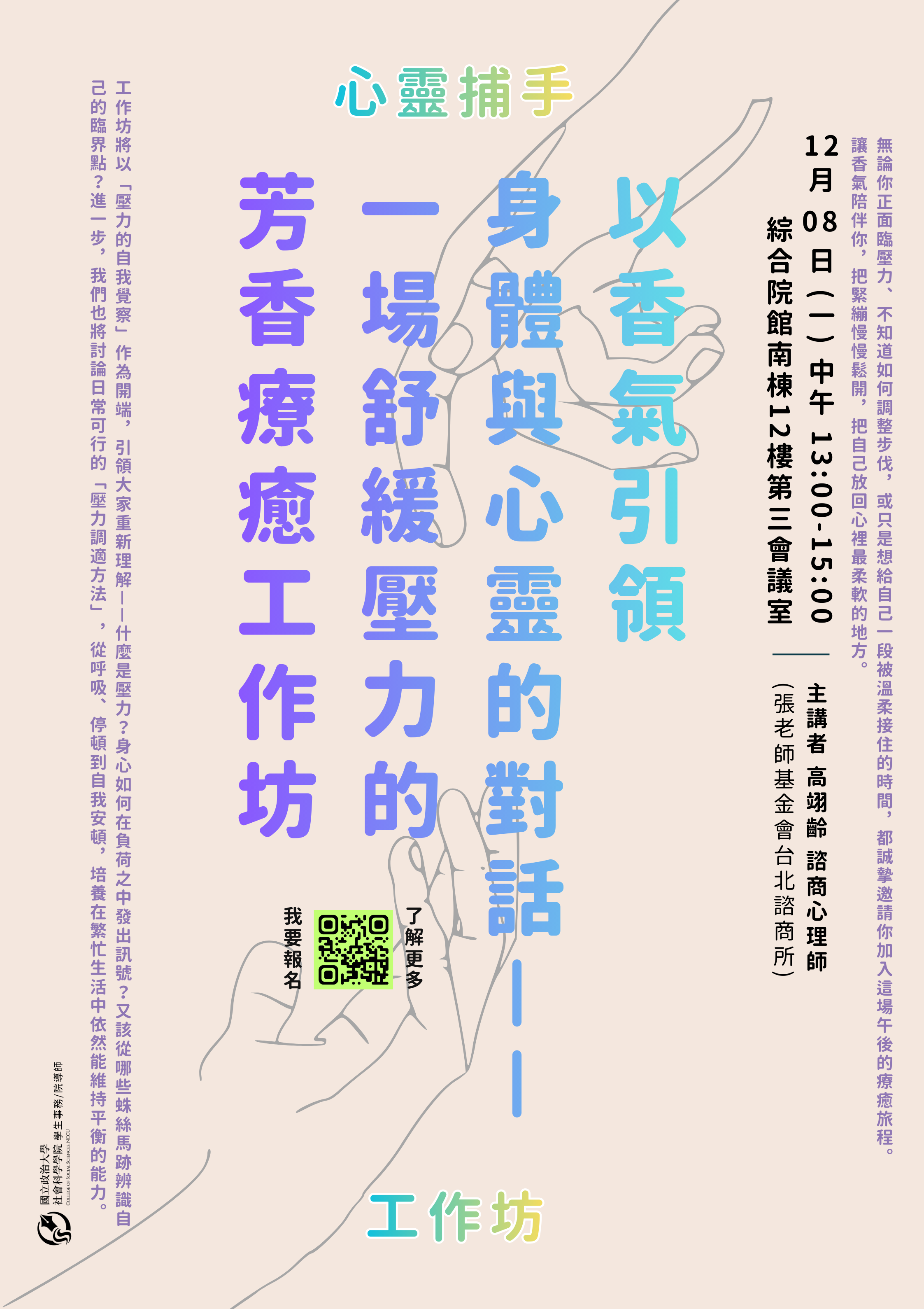 學期即將邁入尾聲,課業、報告與生活壓力紛至沓來,你是否也在不知不覺間繃緊了肩頸、悄悄失去了放鬆與呼吸的空間?政治大學社科院誠摯邀請您,放下片刻忙碌,在午後走進一場由香氣牽引的身心療癒之旅。